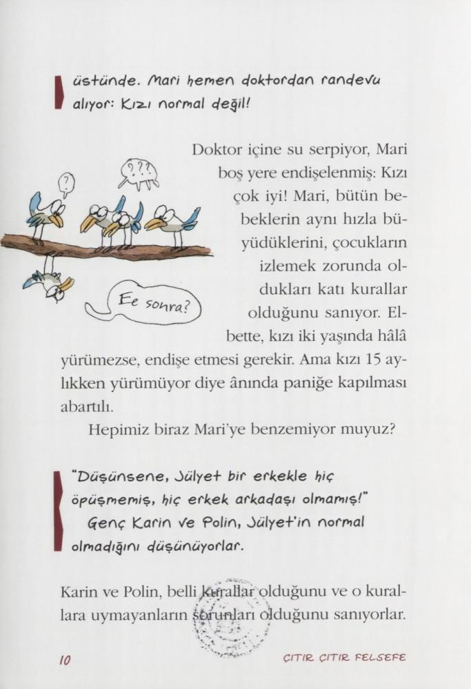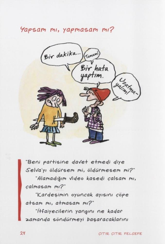 Bakan Yanık paylaşımın devamında, “Bahsettiğiniz ‘Çıtır Çıtır Felsefe’ serisi incelenmiş ve tamamı değil içlerinde sakıncalı içerikler olduğu tespit edilen 7 kitap muzır ilan edilmiştir. Yersiz iddiaların aksine, muzır ilan edilen bir kitap sansürlenmez veya yasaklanmaz. Ekte, bahsedilen yayın serisinde kurulumuzun muzır olarak tespit ettiği bazı örnekleri bırakıyorum. Bunların muzır olmadığını iddia etmek için iki ihtimalin söz konusu olabileceğini düşünüyorum.