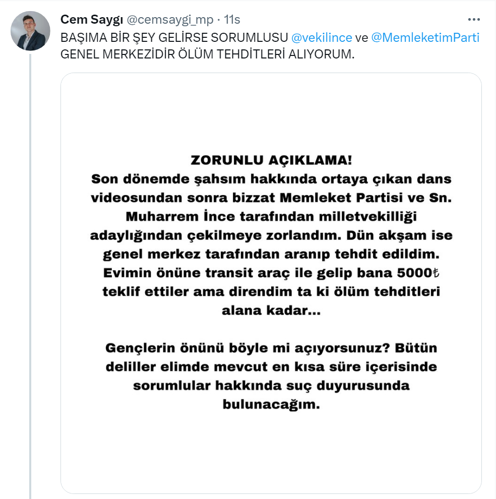 Twitter hesabından bir açıklama paylaşan Cem Saygı, “Başıma bir şey gelirse sorumlusu Muharrem İnce ve Memleket Partisi Genel Merkezi’dir. Ölüm tehditleri alıyorum” iddiasında bulundu. Muharrem İnce’ye “Gençlerin önü böyle mi açıyor” diye sitem eden Saygı şöyle devam etti: