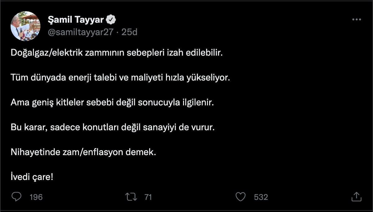 Şamil Tayyar, Twitter hesabından yaptığı paylaşımda, “Doğal gaz/elektrik zammının sebepleri izah edilebilir. Tüm dünyada enerji talebi ve maliyeti hızla yükseliyor. Ama geniş kitleler sebebi değil sonucuyla ilgilenir. Bu karar, sadece konutları değil sanayiyi de vurur. Nihayetinde zam/enflasyon demek. İvedi çare!” ifadesini kullandı.