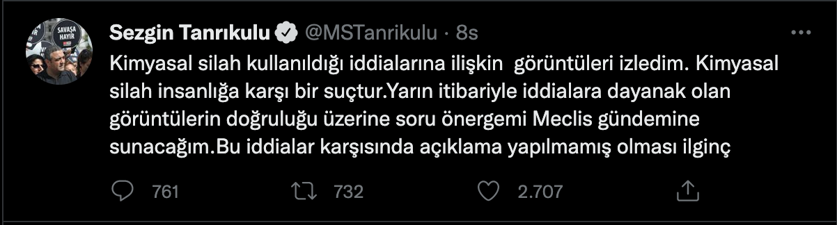 CHP’li Sezgin Tanrıkulu, Twitter hesabından şu paylaşımı yaptı: “Kimyasal silah kullanıldığı iddialarına ilişkin görüntüleri izledim. Kimyasal silah insanlığa karşı bir suçtur. Yarın itibariyle iddialara dayanak olan görüntülerin doğruluğu üzerine soru önergemi Meclis gündemine sunacağım. Bu iddialar karşısında açıklama yapılmamış olması ilginç.”