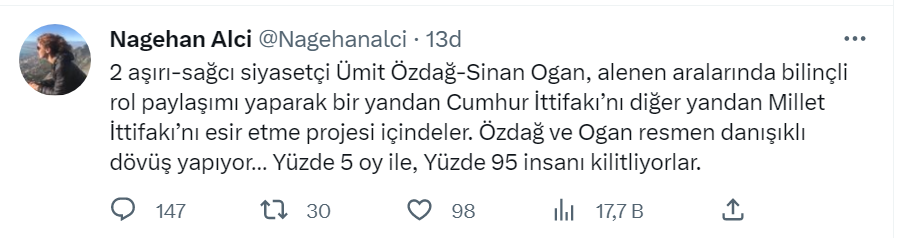 – İki aşırı-sağcı siyasetçi Ümit Özdağ-Sinan Ogan, alenen aralarında bilinçli rol paylaşımı yaparak bir yandan Cumhur İttifakı’nı diğer yandan Millet İttifakı’nı esir etme projesi içindeler. Özdağ ve Ogan resmen danışıklı dövüş yapıyor… Yüzde 5 oy ile, Yüzde 95 insanı kilitliyorlar.