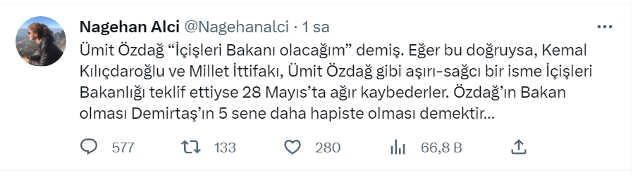 Zafer Partisi lideri Ümit Özdağ’ın 28 Mayıs’ta yapılacak olan cumhurbaşkanlığı seçimi ikinci tur oylamasında Kemal Kılıçdaroğlu’nu destekleme karşılığında seçimin kazanılması durumunda İçişleri ve Kültür Bakanlığı sözü aldığı ortaya çıktı. Habertürk yazarı Nagehan Alçı, sosyal medya üzerinden Kemal kılıçdaroğlu’na tepki gösterip, ikinci turu kesin kaybedeceğini yazdı. İşte Nagehan Alçı’nın sosyal medya paylaşımları…